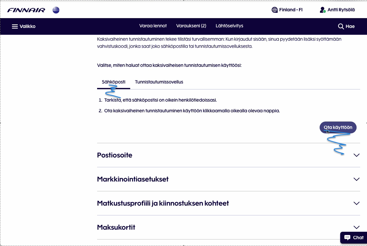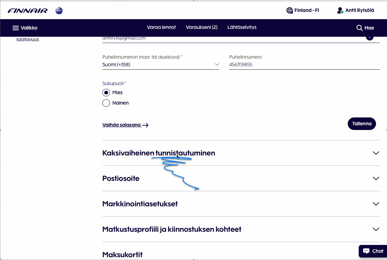 Mene sivulla vähän alaspäin ja valitse "Kaksivaiheinen tunnistautuminen"